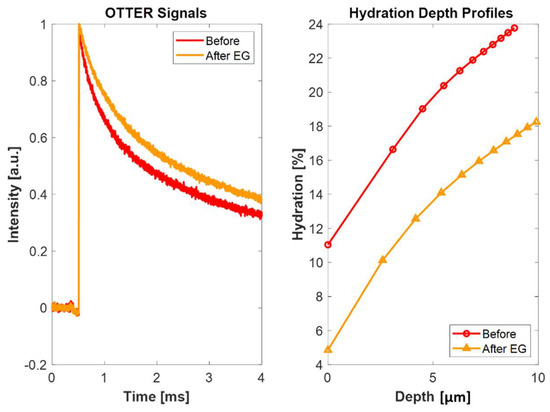 The OTTER signals at 13.1 μm (left) and corresponding depth profiles of Site D before and after a 5 min ethylene glycerol application (right).