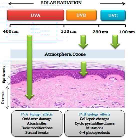- D’Orazio, J.; Jarrett, S.; Amaro-Ortiz, A.; Scott, T. UV radiation and the skin. Int. J. Mol. Sci. 2013, 14, 12222–12248. [Google Scholar] [CrossRef] [PubMed]