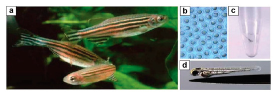 Danio rerio animal model. (a) D. rerio is a small tropical fish of the Cyprinidae family, 4–5 cm in length; (b) 6 h of embryonic development, embryos are ~0.7 mm across; (c) 1-week-old larva swimming in E. tube; (d) embryonic after two days of development, placed on needlepoint.