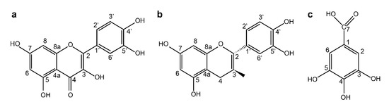 Structure of (a) quercetin, (b) (+)-catechin, and (c) gallic acid isolated from Sanguisorbae Radix.