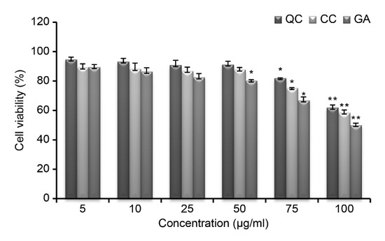 Cells were uniformly dispensed in a 96-well plate (0.18 mL) at a density of 5 × 103 cells/well. QC, CC, and GA were prepared at concentrations of 5, 10, 25, 50, 75, and 100 μg/mL, and 0.02 mL of the solution was added. Then, the cells were cultured in a 5% CO2 incubator at 37 °C for 24 h. Next, 0.02 mL MTT solution prepared at a concentration of 5 mg/mL was added, and the mixture was cultured for 4 h. Following incubation, the culture solution was removed, and 0.15 mL DMSO was added to each well. After incubation at room temperature for 15 min, absorbance was measured at 540 nm with a Microplate Reader (Winooski, VT, USA). Cell viability was calculated as a percentage of control absorbance.
