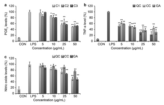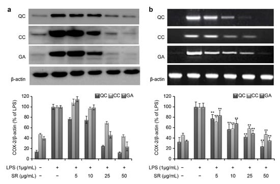 Similar to iNOS, the COX-2 mRNA and protein levels were markedly induced by LPS stimulation (Figure 6). However, the protein expression level of COX-2 was reduced to 12.4%, 44.1%, and 23.8% upon simultaneous treatment with 50 μg/mL QC, CC, and GA, respectively (Figure 6a). Consistent with this, the corresponding COX-2 mRNA expression level was reduced to 23.9%, 47.8%, and 35.5% after treatment with 50 μg/mL QC, CC, and GA, respectively (Figure 6b).