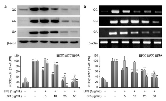 To investigate the molecular mechanism through which these compounds suppress inflammation, we measured the mRNA and protein expression levels of iNOS and COX-2. LPS stimulation of RAW264.7 cells markedly increased iNOS and COX-2 production compared with that in the negative control. As shown in Figure 5a, the protein expression level of iNOS was found to be 20.7%, 36.2%, and 23.8% upon treatment with 50 μg/mL QC, CC, and GA, respectively. Similarly, the mRNA expression level of iNOS was found to be 40.6%, 53.3%, and 37.3% after treatment with 50 μg/mL of QC, CC, and GA, respectively (Figure 5b). Thus, treatment with the SR compounds markedly inhibited the LPS-mediated induction of iNOS mRNA and protein expression.
