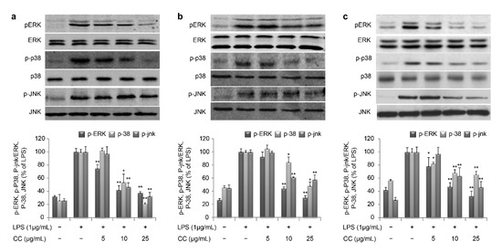 RAW264.7 cells were uniformly dispensed in a 6-well plate at a density of 1 × 105 cells/well and cultured for 24 h. Then, cells were induced with LPS (1 μg/mL) and treated with the control or QC, CC, or GA at concentrations of 10, 25, and 50 μg/mL and cultured. Protein lysates were obtained by incubating the culture with RIPA lysis buffer (Pierce, IL, USA) for 1 h, followed by centrifugation at 12,000 rpm for 30 min at 4 °C. Then, proteins were quantified by Bradford assay (Hercules, CA, USA) according to the manufacturer’s instruction. Equal proteins were electrophoresed using 10% sodium dodecyl sulfate–polyacrylamide gel electrophoresis and transferred to a PVDF membrane (Amersham Pharmacia Biotech, Buckinghamshire, UK) at 60 V for 3 h. After blocking with tris buffer solution containing 5% skim milk for 1 h, the membrane was incubated with dilution of polyclonal antibodies for iNOS, COX-2, IKK, p-IKK, IκB, p-IκB, ERK, p-ERK, p-38, p-p-38, JNK, p-JNK, and β-actin. After extensive washes, the membrane was incubated with the secondary antibody (1:1000 dilution) for 1 h at room temperature. Next, the cells were reacted with Immobilon Western Chemiluminescent HRP substrate (Millipore, MA, USA) and protein levels were analyzed using EZ-Capture MG (ATTO Corporation, Tokyo, Japan).