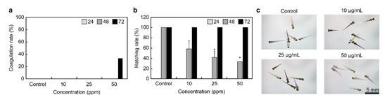 To examine the toxicity of QC, zebrafish embryos were treated with 0, 10, 25, and 50 ppm of QC 12 h post-fertilization, and the coagulation rate and hatching rate of embryos were monitored for 72 h (Figure 9a,b). In the control group, the embryos were treated with egg water 24 and 48 h post-fertilization, and the coagulation rate was 0%. In contrast, the coagulation rate of the group treated with 50 ppm QC for 72 h was 33%. The hatching rate of the embryos from the control group after 48 h was 100%, while that of the embryos treated with 10, 25, and 50 ppm of QC was 58%, 41%, and 33%, respectively, indicating a delay in hatching. According to the results, QC qualified as a safe material at a concentration of 50 μg/ml in the safety experiment using the zebrafish model. Nonetheless, the hatching rate was 100% after 72 h in these treatment groups, indicating that the QC extract is safe. Moreover, zebrafish embryos treated with 10 ppm and 25 ppm of QC did not coagulate and underwent normal embryogenesis, similar to that in the control group.