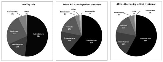 Several skin disorders are characterized by shifts in the skin microbiome, most notably, the loss of protective bacteria, overgrowth of pathogenic bacteria, and increased severity correlating with decreased microbial diversity [23]. At the phylum level, our data showed that reactive and sensitive skin samples were mostly composed of Actinobacteria, Proteobacteria, Firmicutes, and Bacteroidetes, accounting for more than 97% of the total sequencing read in all samples. We also noted that 15 days of application of the HD extract maintained these major phyla (Figure 1).