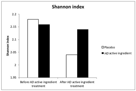 Evolution of the Shannon Diversity index before and after HD active ingredient treatment. White bar for Placebo, black bar for HD active ingredient
