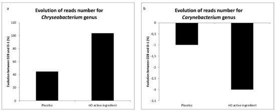 Evolution of the reads number for the Chryseobacterium and Corynebaterium genii during the investigation. a: Evolution of reads number for Chryseobacterium placebo versus HD active ingredient. b: Evolution of reads number for Corynebacterium placebo versus HD active ingredient.