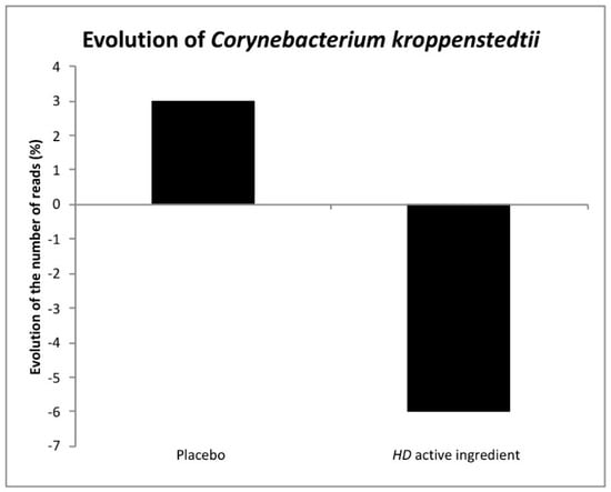 At a species level, Corynebacterium kroppenstedtii (C. kroppenstedtii) has been classified by chemotaxonomic data as a member of the genus Corynebacterium. This species is part of the normal skin microbiota, but increased levels have been associated with skin redness. S. epidermidis is considered a bacterium that is beneficial to skin health. Indeed, an increase in its concentration on the skin can lead to an increased lipid content and reduced water evaporation, improving skin moisture [28]. Moreover, S. epidermidis is involved in the inhibition of Cutibacterium acnes. (C. acnes) inflammation and may enhance the production of antimicrobial peptides to defend against infections [29]. Our results showed that Actinobacteria are mainly represented by C. acnes (72.13%) and C. kroppenstedtii (13.23%), a species particularly observed in the case of redness, the main criteria for volunteer inclusion. The HD active ingredient decreased the amount of this species by 10% (Figure 4). Firmicutes were mainly represented by Staphylococcus epidermidis (35%), with our active ingredient improving this species (12%).