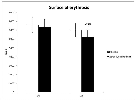 Erythrosis takes the form of diffuse, persistent red patches on the face. It appears as the result of exposome, such as shaving or temperature fluctuations. It mainly occurs around the nose, chin, forehead, and cheeks, and is associated with sensitive skin. In this study, a significant decrease of the surface of erythrosis after 28 days of application of the HD active ingredient was reported (−15%; p < 0.05) (Figure 5).
