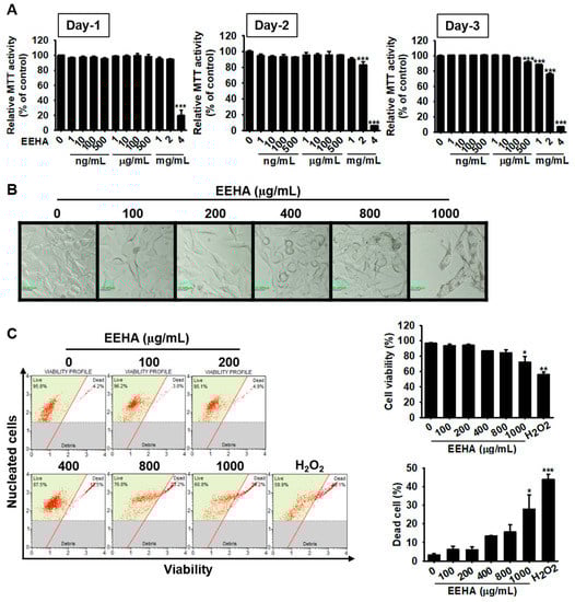 High concentrations of EEHA exert a cytotoxic effect in B16F10 melanoma cells. B16F10 melanoma cells were seeded in a 24-well plate at a density of 5 × 104 cells/mL, and treated with EEHA at the indicated concentrations (0–4 mg/mL) for 72 h. (A) MTT assay was performed at regular 24 h intervals for up to 72 h, and MTT activity was represented as a percentage (%) relative to that of the untreated group. (B) The images of the cells were captured by phase-contrast microscope (20×) at 72 h. (C) Cytotoxicity of EEHA was measured by flow cytometry at 72 h (left), and cell viability (top right) and the population of dead cells (bottom right) was represented. The results represent the average of data obtained from three independent experiments and expressed as the mean ± SEM (*** p < 0.001, ** p < 0.01, and * p < 0.05 vs. the untreated group).