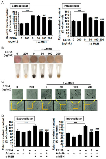 B16F10 melanoma cells were treated with EEHA at the indicated concentrations (0–200 μg/mL), and extracellular and intracellular melanin contents were measured [17]. Briefly, B16F10 melanoma cells were cultured at a density of 5 × 104 cells/mL in 6-well plates overnight. Then, EEHA was treated in the presence or absence of 500 ng/mL α-MSH for 72 h, and the culture media and cell pellets were collected. The absorbance of culture media was measured at 405 nm for extracellular melanin content. The cell pellets were washed with ice-cold PBS, dissolved in 400 µL of 1 M NaOH containing 10% DMSO at 90 °C for 60 min, and then the absorbance at 405 nm was measured for intracellular melanin content.