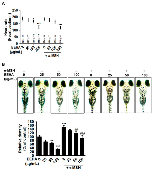 Zebrafish were raised and handled according to standard guidelines of the Animal Care and Use Committee of Jeju National University (Jeju, Korea). Inbreed AB strain of zebrafish was mated and eggs were collected. The eggs were kept in E3 embryo media (34.8 g NaCl, 1.6 g KCl, 5.8 g CaCl2·2H2O, and 9.78 g MgCl2·6H2O in 1 L distilled water, pH 7.2) supplemented with 1% methylene blue for 48 h and treated with 200 nM PTU containing E3 media for another 24 h. The larvae at three days post-fertilization (dpf) were treated with EEHA at the indicated concentrations in the presence or absence of α-MSH for 72 h. Images were captured by a stereomicroscope (Olympus SZ2-ILST, Tokyo, Japan) and the heart rate was also measured to evaluate cardiotoxicity of EEHA.
