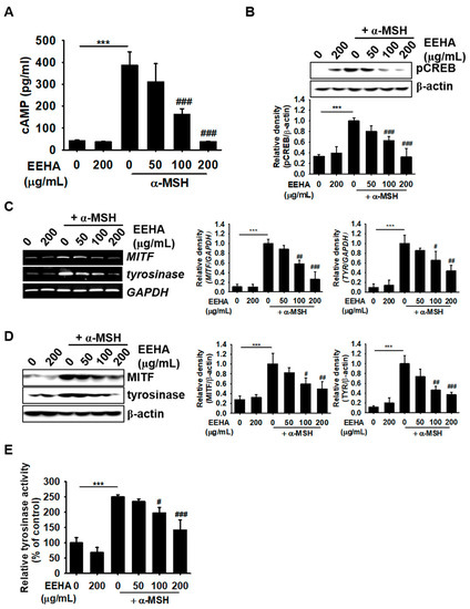 Since the binding of α-MSH to MC1R stimulates the GPCR signaling pathway, we investigated whether EEHA inhibits cAMP-mediated melanogenesis. As depicted in Figure 4A, EEHA significantly downregulated the increase in cAMP levels induced by α-MSH from 386.6 ± 61.1 to 38.2 ± 1.3 pg/mL at a concentration of 200 µg/mL, which was similar to the cAMP level in the untreated group (41.4 ± 4.8 pg/mL). At a concentration of 100 µg/mL, EEHA also inhibited the increase in cAMP levels induced by α-MSH to approximately 50%. Since the upregulation of cAMP is directly associated with the phosphorylation of CREB, we evaluated the effect of EEHA on CREB phosphorylation. As expected, at a concentration of 200 µg/mL, EEHA downregulated the levels of phosphorylated CREB in B16F10 melanoma cells by 3.2 folds in comparison to that of α-MSH-treated group (Figure 4B). Additionally, the α-MSH-induced expression of both MITF and tyrosinase was markedly downregulated to approximately 70% and 60%, respectively, by 200 µg/mL of EEHA, and the expression of both MITF and tyrosinase was reduced by approximately 50% when the concentration of EEHA was 100 µg/mL (Figure 4C). Consistent with the expression data for MITF and tyrosinase, EEHA downregulated the α-MSH-induced expression of MITF and tyrosinase protein (Figure 4D). We additionally identified that the activity of cellular tyrosinase was markedly increased by α-MSH (249.9% ± 6.7%) in comparison to that of the untreated group (100% ± 17.2%). However, the increase in cellular tyrosinase activity was significantly attenuated by EEHA (197.8% ± 17.6% and 141.9% ± 33.2% at 100 and 200 μg/mL, respectively; Figure 4E). Altogether, these results indicate that EEHA inhibits the activity of cellular tyrosinase by suppressing the cAMP–CREB–MITF axis, resulting in the anti-melanogenic activity of EEHA.