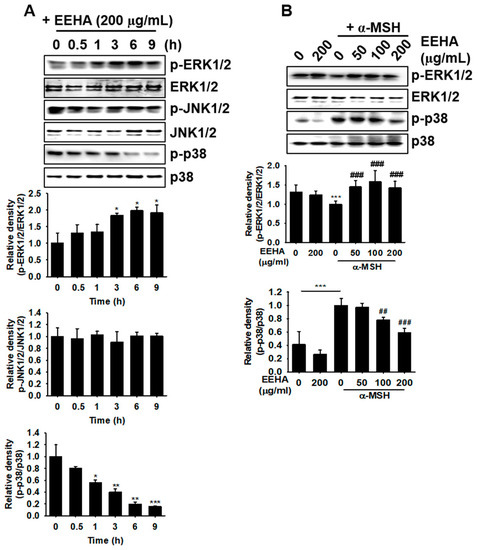 EEHA increases ERK phosphorylation and p38 MAPK dephosphorylation. (A) B16F10 melanoma cells (5 × 104 cells/mL) were treated with EEHA at the indicated concentrations (200 μg/mL) and Western blotting was performed for detecting the expression of p-ERK1/2, p-JNK1/2, and p-p38. (B) The cells were exposed to EEHA at the indicated concentrations of (0–200 μg/mL) in the presence or absence of 500 ng/mL α-MSH for 9 h, and the expression of p-ERK1/2 and p-p38 was analyzed. The total forms of the respective target proteins were used as the internal control. The relative density was calculated using ImageJ software. The results represent the average of data obtained from three independent experiments and are expressed as the mean ± SEM (*** p < 0.001, ** p < 0.01, and * p < 0.05 vs. the untreated group; ### p < 0.001 and ## p < 0.01 vs. the α-MSH-treated group).