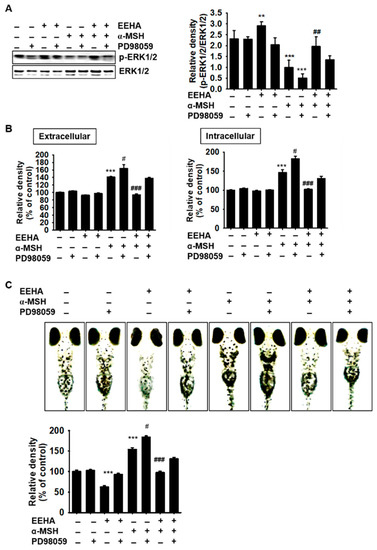 We subsequently verified whether ERK was involved in the EEHA-mediated anti-melanogenesis observed herein. It was observed that α-MSH downregulated the phosphorylation of ERK, and ERK phosphorylation was more strongly inhibited following combined treatment with α-MSH and PD98059, in comparison to that of the group treated with α-MSH only (Figure 6A). On the other hand, EEHA significantly increased ERK phosphorylation, which was downregulated by treatment with α-MSH and PD98059. Additionally, in comparison to those of the untreated group, PD98059 upregulated both extracellular (from 141.4% ± 1.3% to 164.1% ± 10.4%) and intracellular (from 146.3% ± 7.4% to 182.6% ± 6.7%) melanin content that was induced by α-MSH in B16F10 melanoma cells (Figure 6B). The EEHA-mediated anti-melanogenic activity was reversed in the presence of PD98059, which reduced both extracellular (90.1% ± 2.7% and 137.9% ± 2.0% in the α-MSH+EEHA-treated and α-MSH+EEHA+PD98059-treated groups, respectively) and intracellular (102.1% ± 2.5% and 130.4% ± 6.4% in the α-MSH+EEHA-treated and α-MSH+EEHA+PD98059-treated groups, respectively) melanin contents, indicating that EEHA upregulated ERK phosphorylation, which consequently induced anti-melanogenesis. Moreover, PD98059 and/or α-MSH significantly enhanced melanogenesis in the zebrafish larvae (150.1% ± 4.1% and 184.1% ± 4.1% in the α-MSH-treated and α-MSH+PD98059-treated groups, respectively), in comparison to that of the untreated group (Figure 6C). Furthermore, EEHA was unable to inhibit the melanogenesis induced by α-MSH in the presence of PD98059 (97.5% ± 3.7% and 130.9% ± 3.9% in the α-MSH+EEHA-treated and α-MSH+EEHA+PD98059-treated groups, respectively), which indicated that the activation of ERK by EEHA induced the anti-melanogenic properties observed in vivo. Collectively, these results indicated that the anti-melanogenic properties of EEHA in B16F10 melanoma cells and zebrafish larvae are mediated via the activation of the ERK signaling pathway.