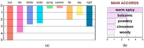 Fragrantica also indicates the set of five or six odor descriptors that are most noticeable. This information is displayed as a bar chart called “main accords”. The length of each bar was measured using an ordinary ruler, and the values were expressed on a continuous scale from 0 to 5 (Figure 1b). The maximum value was assigned to the largest bar, whose length was the same for all fragrances. The ratings for “woody” are denoted as Xwoody, and so on for the rest of the attributes.