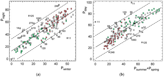 By applying stepwise regression for observations with Nvotes > 70, Equation (5) was obtained to estimate Pday (R2 = 0.50, n = 141, prc < 0.008). Seasonal percentages, Scool, and Sfloral were not considered. Regarding the prediction of the four seasonal percentages, it was checked that they reasonably followed a normal distribution. These values were not reliable for observations with Nvotes < 70, and they were disregarded. The predictive equation for Pwinter (R2 = 0.52, n = 141, prc < 0.001) is not shown because variables entering into the model and their coefficients were nearly equivalent to Equation (5), which implied a tight association between Pwinter and Pnight (Figure 4a).