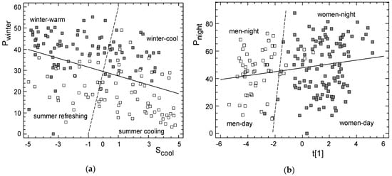 Sensory maps of 176 fragrances. Dashed lines were drawn to divide the scatterplot into four meaningful sections. (a) Fitted linear regression between winter preference (Pwinter) versus cool odor character (Scool). Filled points: t(2) < 0 (i.e., warm perfumes); (b) plot of fitted linear regression between preference for nighttime wear (Pnight) versus t(1) scores obtained from the final PCA. Filled points: women’s fragrances.