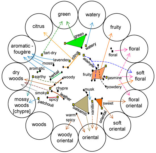 Oriental perfumes are exotic, opulent, and warm, containing musks and sweet spicy odors such as cinnamon and vanilla. The position of odor descriptors in Figure 6 is consistent with the typical scents of this odor class. Soft–oriental perfumes are not as sweet as the true oriental ones, which are mainly based on flowers and warm spices. The floral–oriental category moves toward floral scents, which are subtly spicy and are blended with notes of amber, aldehydes, or fruits. Finally, soft–floral fragrances are characterized by sparkling aldehydes and delicate flowers, creating a family of soft abstract florals that are often powdery [11]. In summary, the odor descriptors that are nearest to each category of the Fragrance Wheel have a reasonable correspondence with the most typical notes encountered in each class.