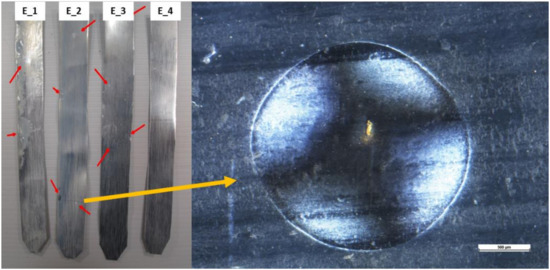Samples E, where the red arrows indicate the presence of bubbles. On the right, the magnification of one of these bubbles is shown.