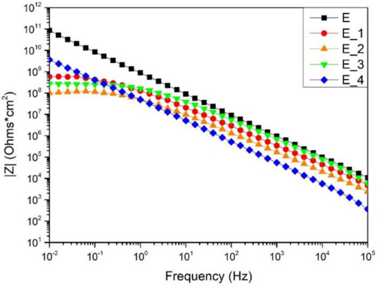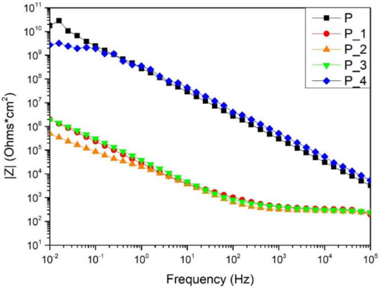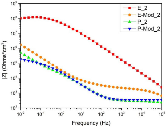 Figure 7 reported the EIS Bode modulus spectra comparing the behavior of the four types of samples after being exposed in environment 2: it shows that polyester samples (P and P-Mod) have an extremely low value of |Z|, while E (epoxy-based) maintains a just acceptable behavior. Despite this, the modification of the epoxy resin leads to a decrease in corrosion resistance properties. Sample E-Mod, in fact, degrades and shows a very similar impedance module to that of the polyester resins. In the electrochemical impedance measurements, the test in environment 2 has proved to be critical for sample E-Mod, as seen in Figure 7, but this result was not found in other tests. The E-Mod_2 sample appeared to be intact and without visible defects after the pack test. However, it must be considered that the EIS measurements are more sensitive to the presence of defects in the organic layers, and therefore they are more representative of the true state of degradation of the coating. For example, at high frequencies there is the time constant relative to the organic coating. The difference in modulus observed is relative to the fact that, except for E_2, the coatings show low protection and therefore a very low coating resistance.