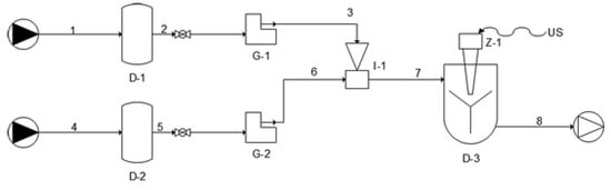 Piping representation for the experimental setup for the simil-microfluidic method: (1–2–3) lipids/ethanol feed line; (4–5–6) water feed line; (D-1 and D-2) feed tanks; (G-1 and G-2) peristaltic pumps; (I-1) injector (production section); (7–8) water/ethanol nanoliposomes suspension; (D-3) recovering/homogenizing tank (from [38], published by The Royal Society of Chemistry).