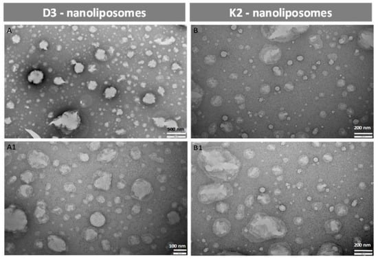 Transmission electron microscopy (TEM) images of D3 and K2 nanoliposomes fresh samples (A and B, respectively) and after 1 month of storage (A1 and B1, respectively).
