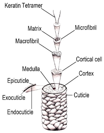 Sketch representing the hierarchical structure of a hair fiber. Reprinted from [3] under a Creative Commons Attribution 4.0 International License.