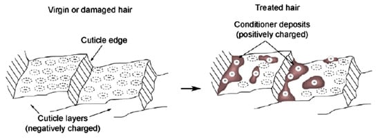 There are many factors which can influence the integrity of the hair surface, with the removal of the fatty acids covalently linked to the outermost surface of the cuticle or the oxidation of the disulfide bonds from the cystine residues to cysteic acid considered two of the most common alterations. This results in the formation of an excess of acidic groups on the hair surface, which undergo a dissociation process in aqueous medium, and hence the presence of many negatively charged residues on the fiber surface is found. The anionic residues on the fibers surface make them susceptible to interacting with the positively charged chemical species, generally polycations, existing in conditioners [1,9,19,24,34,35]. This interaction favors the deposition of the conditioning molecules onto the fibers, reducing their static electricity and improving the lubrication of hair fibers as well as the manageability and combing. This is because the deposition of the conditioner layer enables the flattening of the cuticle scales against each other. Figure 3 presents a scheme showing the aspect of the hair surface before the conditioning (virgin or damaged hair) and upon the deposition of a conditioner layer.