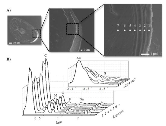 The images of electron microscopy allow evaluating the efficiency of the deposition of the conditioning agents, which is clearly focused on the most external region of the fibers. However, electron microscopy does not provide information related to the penetration and absorption of the conditioning species to the inner regions of the fibers. The combination of electron microscopy images with electron dispersive spectroscopy helps to determine the role of the penetration of the conditioning species into the fiber. The spectra shown in Figure 4 show that the penetration is limited, as evidenced by the existence of S in the inner regions of the hair.