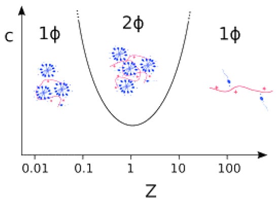 A closer look to the complexation process evidences the existence of up to four different regions in the phase diagram of polyelectrolyte–surfactant mixtures [85]. Assuming that the ionic strength and the temperature are fixed parameters, the ratio between the surfactant and monomer concentrations allows defining the boundaries between different regions appearing in the phase diagram [86]. At low surfactant concentration, the system is in a regime in which the excess of polymer governs the properties of the mixtures, even though indirect evidence of the surfactant binding to the polyelectrolyte chains can be found. However, no evidence of a true neutralization of the charge of the polymer chain as result of the binding is found until a critical value for the concentration is overcome, the so-called critical aggregation concentration (CAC). Once the concentrations is above the CAC, further increases of the amounts of surfactant lead to a progressive neutralization of the net charge of the complexes up to the isoelectric point, where neutral complexes are formed [87]. The complexes obtained in the vicinity of the isoelectric point have a poor colloidal stability, thus driving the system to the onset of a phase-separation region (2ϕ). The emergence of the phase separation is evidenced by the formation of precipitates, gels or other ordered structures enriched in polyelectrolyte–surfactant complexes [88,89,90]. It is worth mentioning that the stoichiometry of the complexes formed within the phase-separation region can be highly variable and depends on the specific nature of the considered mixture and the solution properties [87], even though the stronger effect associated with the phase separation occurs when 1:1 complexes are formed [91,92]. Once the isoelectric point is overcome, the addition of further amounts of surfactant results in an inversion of the charge of the formed complexes, i.e., overcompensated complexes, in which the excess of surfactant charges enables the dissolution and restabilization of the phase-separated complexes, driving again to a one-phase-region (1ϕ) [79,84,93,94]. There are several parameters that influence the phase separation–resolubilization of the polyelectrolyte–surfactant complexes, with the charge density of the polyelectrolyte chains and the ionic strength probably being the most important one. Figure 6 shows a schematic representation of the phase diagram for an arbitrary polyelectrolyte–surfactant mixture, in which the different phases are represented in terms of the Z ratio (ratio between the number of monomers and surfactant molecules).