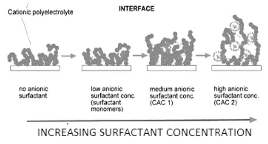 The study of the adsorption processes of polymer–surfactant systems onto solid substrates is of interest for the cosmetic industry. This is because the performance of shampoo and conditioners is related to the deposition of polymer–surfactant complexes onto the surface of hair fibers, with the latter being a relatively large effective surface with an extraordinary chemical and topographic complexity [8,95]. The adsorption of the polymer–surfactant complexes onto solid surfaces depends on various factors such as the properties of the polymer (charge, molecular weight, concentration), the surface (charge, surface energy) and the solution (pH, temperature, solvent quality, ionic strength) as well as the nature and concentration of the surfactant [9,79,96,97,98]. Furthermore, the proximity of the phase-separation region plays an important role in the adsorption and its efficiency. It is worth noting that the adsorption of polyelectrolyte–surfactant mixtures is a rather complex process in which the simultaneous adsorption of free surfactant molecules and polymer chains together with the adsorption of the complexes may be expected [99]. Figure 7 shows the different regions for the adsorption of polyelectrolyte–surfactant mixtures as function of the surfactant concentration.