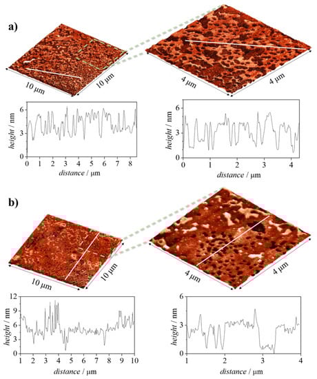 AFM images for the deposition of a model conditioning formulation onto a negatively charged surface: (a) obtained in the border of the phase-separation region; (b) obtained in the phase-separation region. Reprinted from [7], Copyright (2020), with permission from Elsevier.