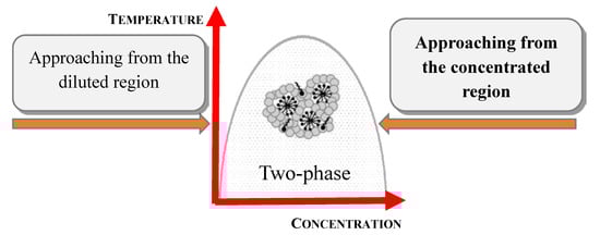 The application process of the commercial product is governed by the phenomenon called precipitation-enhanced deposition as a consequence of the dilution process occurring during washing, with this being known as the Lochhead effect [21]. The washing and subsequent rinsing of the hair drives the system into the phase-separation region, which results in an enhanced deposition of the conditioning material onto the fiber surfaces. Such deposition is the result of the precipitation of the complexes which favors foaming and enhances the lubrication property of fibers and the adsorption of colloidal materials such as silicone emulsions, impacting consumer satisfaction [105,106]. Figure 9 shows the two approaches commonly used for studying the behavior of polyelectrolyte–surfactant mixtures.