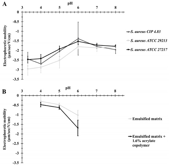 Electrophoretic mobility of the three S. aureus strains (A) and the lipid droplets of a model matrix (B) at a pH from 3 to 8. Data are expressed as the mean ± standard deviation of two biologic replicates.