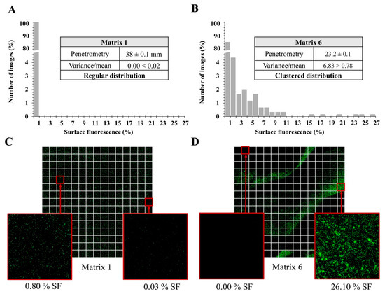 Figure 2A,B shows the frequency distribution of surface fluorescence (SF), the mean and the variance for two of the six matrices taken as an example. For matrix 1, the variance of the SF was inferior to the mean, which indicates a bacterial regular distribution. Figure 2C illustrates the regular distribution in matrix 1 showing one series of 225 images. Matrices 2 to 5 showed a similar regular distribution with SF means between 0.03% and 0.45% (data not shown). The matrices 1 to 5 had low viscosities, with penetration values superior to 32 mm. In contrast, matrix 6 showed a bacterial clustered distribution with a variance of SF superior to the mean (Figure 2B,D). Matrix 6 had the highest viscosity, with a penetration value of 23.2 ± 0.1 mm.