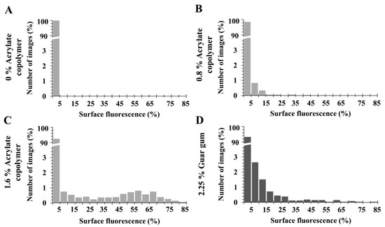 Frequency distribution of surface fluorescence of S. aureus CIP 4.83 in matrices with various concentrations of acrylate copolymer (A) 0%, (B) 0.8%, and (C) 1.6%) or guar gum (D) 2.5%.