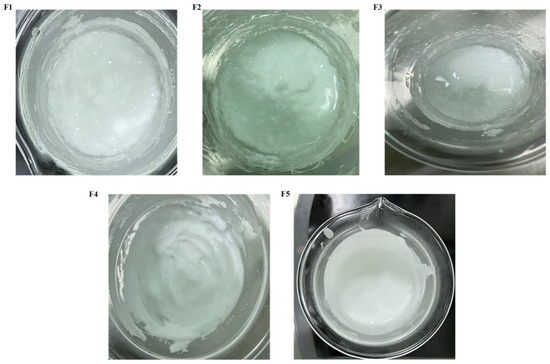 Appearance and various types of instability observed in different formulations. (F1) congealing and creaming were observed, (F2) formation of lumps and phase separation were observed, (F3) oil separation was observed, (F4) stable moisturizing cream, and (F5) stable moisturizing lotion.
