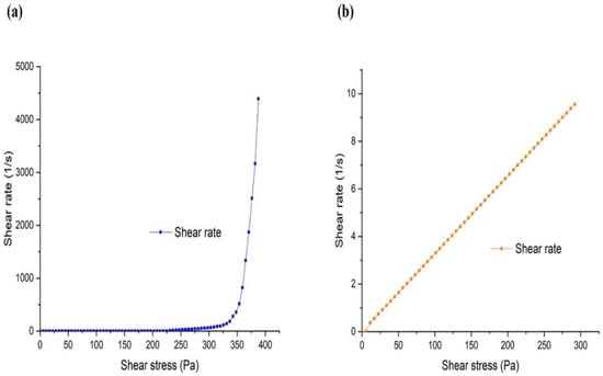 The consistency of the semisolid preparation is one of the key attributes of topical formulations, as it is applied to the skin as a thin layer. Usually, the consistency of any semisolid formulation is indicated by its viscosity [32]. It was observed that the viscosity of the cream and lotion was inversely related to the shear stress. The viscosity decreases with an increase in shear stress, indicating the non-Newtonian behavior of flow; this behavior is favored because of its low resistance to flow when applied under high shear conditions [30,33,34]. The viscosity of the developed cream and lotion formulation was determined by a Brookfield rotational rheometer (Brookfield Engineering Laboratories, Inc., Middleboro, MA, USA) of the cone and plate type using spindle C50-1. The viscosity of the moisturizing cream and lotion formulations was found to be 8427.52 ± 7.36 Pa·s and 312.26 ± 1.68 Pa·s at a shear stress of 50.56 Pa and 5.62 Pa and a shear rate of 0.01 s−1 and 0.02 s−1, respectively. The results of the rheological behavior of the moisturizing cream and lotion are shown in Figure 3. Figure 3 illustrates that the rheological behavior of the moisturizing cream exhibits a pseudo-plastic flow, while the moisturizing lotion exhibits a Newtonian flow.
