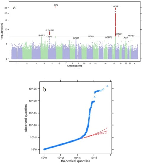 The strongest association was found in the interferon regulatory factor 4 (IRF4) locus on chromosome 6. The top variant, rs12203592 (p-value = 1.0 × 10−26; OR = 1.36 [1.28–1.44]) is an intergenic variant, located close to the IRF4 gene, which encodes for the transcriptional activator of the MHC class I promoters [,]. IRF4 (and the top variant) have been reported to be associated with skin pigmentation [].
