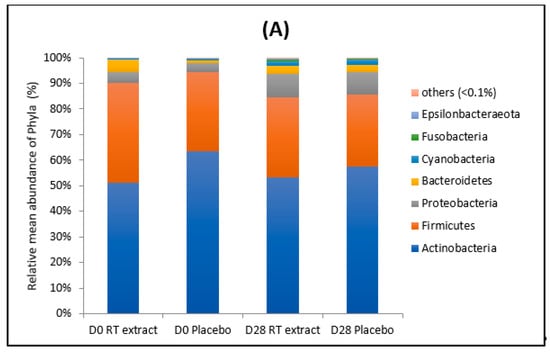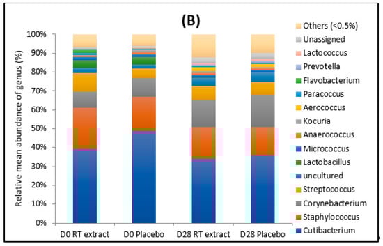 As shown in Figure 1, major phyla were Actinobacteria (average 56%) followed by Firmicutes (average 32%). Cutibacterium was the most abundant genus (average 40%), followed by Staphylococcus (average 18%), Corynebacterium (average 12%), and Streptococcus (average 7%) both at D0 and D28, with no significant differences between placebo and RT extract treatment.