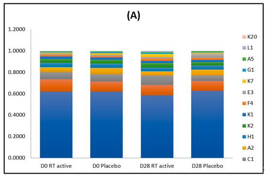When the diversity index was compared between treatments using the non-parametric Wilcoxon test, diversity expressed by the Shannon index appeared to be statistically higher (p < 0.05) after 28 days of treatment with RT active ingredient when compared with D0.