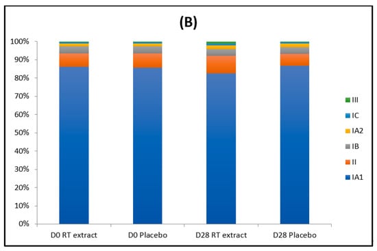 At D0, phylotype IA1 was the most represented, followed by phylotypes II, IB, IA2, IC, and III. High relative abundance of phylotype IA1 is also observed when skin from patients with severe and mild acne was compared []. A higher incidence of phylotype IA1 in acne occurrence or severity may be due to its higher capacity to adhere to skin and form biofilms. Another hypothesis is that phylotype IA1 and II strains show different hyaluronate lyase activity, wherein phylotype IA1 is less active and partial degradation of hyaluronic acid may produce various oligosaccharides that could be related to the inflammatory process induced by acne. After 28 days of RT extract treatment, phylotypes repartition was modified with a decrease in abundance (approximately 4%) of phylotype IA1 and an increase in phylotype II and III. The changes were not observed after placebo treatment (Figure 2). Phylotype III, which is characterized by high pro-inflammatory potential in skin explants, does not seem to be related to acne []. Phylotype II participates in the skin microbiome and is not relevant in the pathology of acne []. We hypothesize a different antibacterial sensitivity of the diverse phylotypes after RT extract treatment.