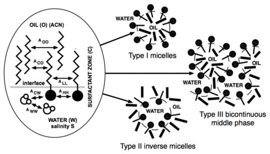 Interactions of the surfactant molecule adsorbed at the oil–water limit with neighboring water and oil molecules found in swollen micelles (Type I) or inverse micelles (Type II), as well as in middle phase lamellae or other complex bicontinuous structure (Type III).
