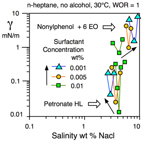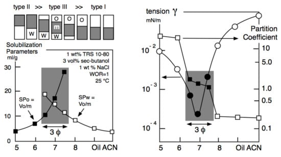 More detailed information on the tension and solubilization in this WIII diagram may be found elsewhere [54,55]. In practice, the range with three-phase behavior in the scan is relatively narrow; it is actually narrower when the minimum tension is lower [56,57,58].