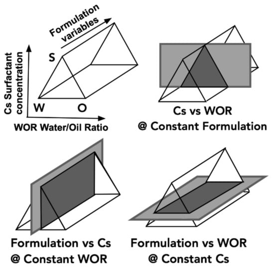 Since the usual way to show a graph is a 2D representation, the 3D space is cut by three kinds of planes shown in Figure 4. The first one is the constant formulation cut that results in the so-called Winsor’s ternary diagram that allows a decision on the required amount of the SOW ingredients to attain an appropriate phase behavior or property once the formulation is fixed, as seen later.