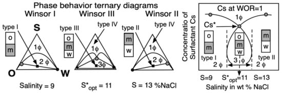 It can be seen that, close to the optimum formulation (at S* = 11 wt% NaCl in Figure 5), a three-phase behavior happens with a middle-phase microemulsion in equilibrium with excess water and excess oil. These excess phases (black circles) contain a very small concentration of surfactant, slightly above its critical micelle concentrations, as seen essentially to be close to zero in the lower part of the ternary triangle in the Winsor III diagram. At the top of the three-phases triangle (micro-emulsion indicated as a circle point in grey), the better solubilization is attained, i.e., there is a minimum surfactant requirement Cs* to reach the type IV single phase zone.