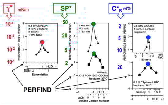 In Figure 6, the variation of PERFIND is showed in three different formulation variable scans (surfactant ethoxylation number EON, water salinity S, oil ACN), showing the numerical equivalence of performance index (PERFIND) with other quality criteria like the minimum tension γ*, the maximum solubility parameter SP* and the minimum surfactant concentration C*s to attain a single phase [11,60].