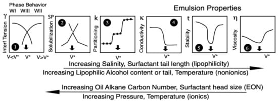 The emulsion stability is shown to pass through a very deep minimum in Figure 7(5), i.e., the emulsion becomes very unstable, probably because the surfactant has a lower chemical potential in the microemulsion middle phase than at the oil–water interface, where it has to be to generate stabilization mechanisms. Consequently, it may be said that at optimum formulation, the surfactant seems to be trapped in the microemulsion and that the oil/water mixture dispersed as drops by the stirring would coalesce instantly in practice, as it would be in complete absence of surfactant. This specific emulsion strong instability at optimum formulation has recently been found to match, and thus probably to result from, a very low interfacial rheology elasticity through a low dilational modulus [64,65,66]. The detection of the minimum stability in emulsified system is besides the quickest way to detect the optimum.
